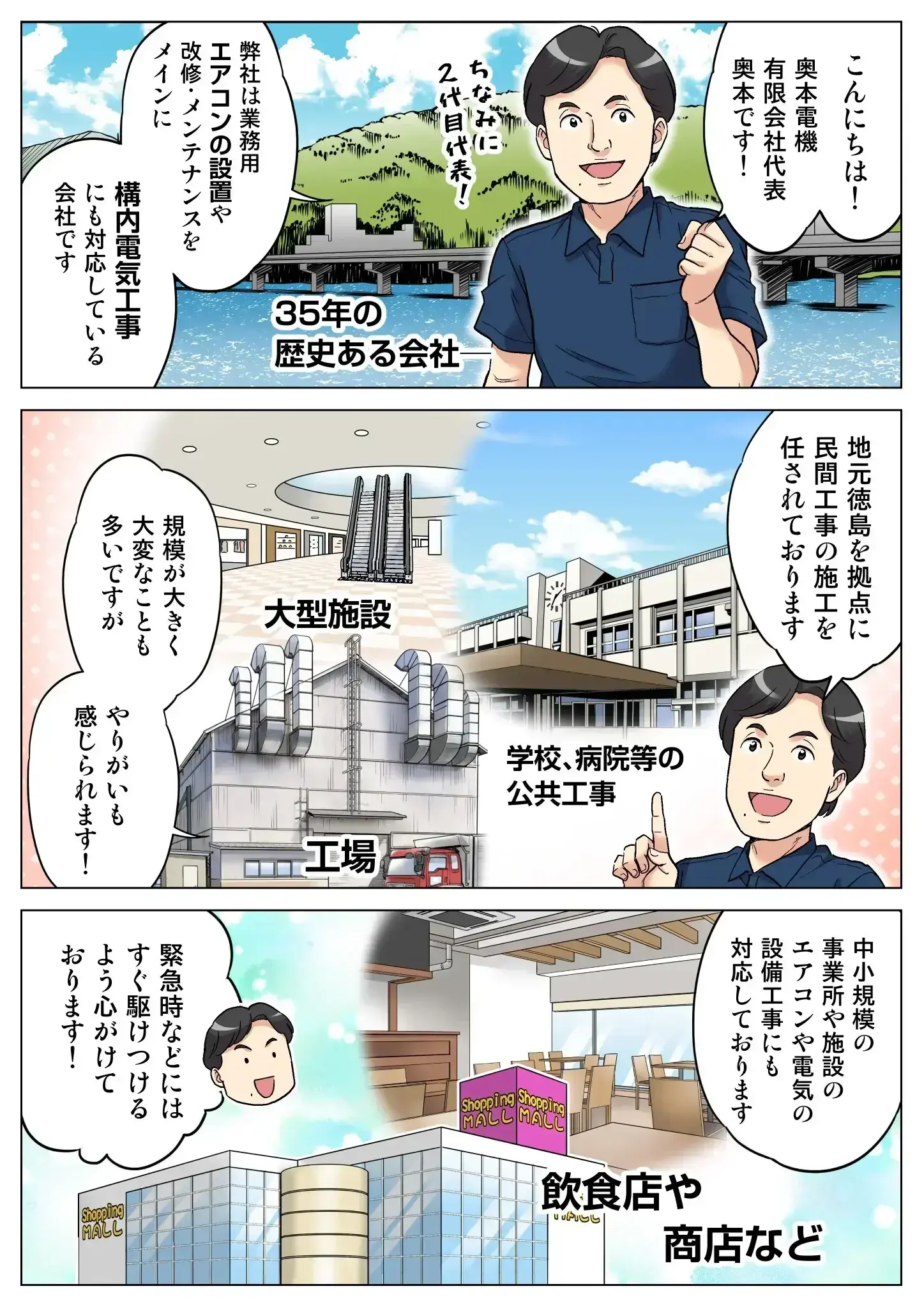 35年以上の長い歴史がある奥本電機。弊社の会社概要についてマンガでご紹介します。